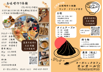 エプロン、大きめの容器(味噌を持ち帰る用)をご持参ください。